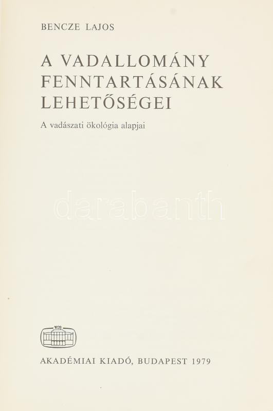 Bencze Lajos: A vadállomány fenntartásának lehetőségei. A vadászati ök... https://www.darabanth.com/hu/442-Gyorsarveres/442.0/Konyvek/Konyvek-Vadaszat~1000015/Bencze-Lajos-A-vadallomany-fenntartasanak-lehetosegei-A-vadaszati-okologia-alapjai-Bp-~II2910157