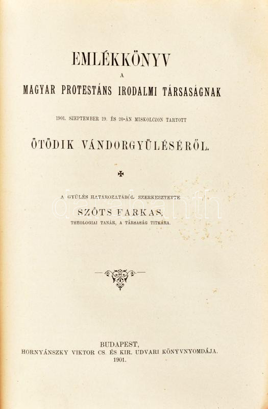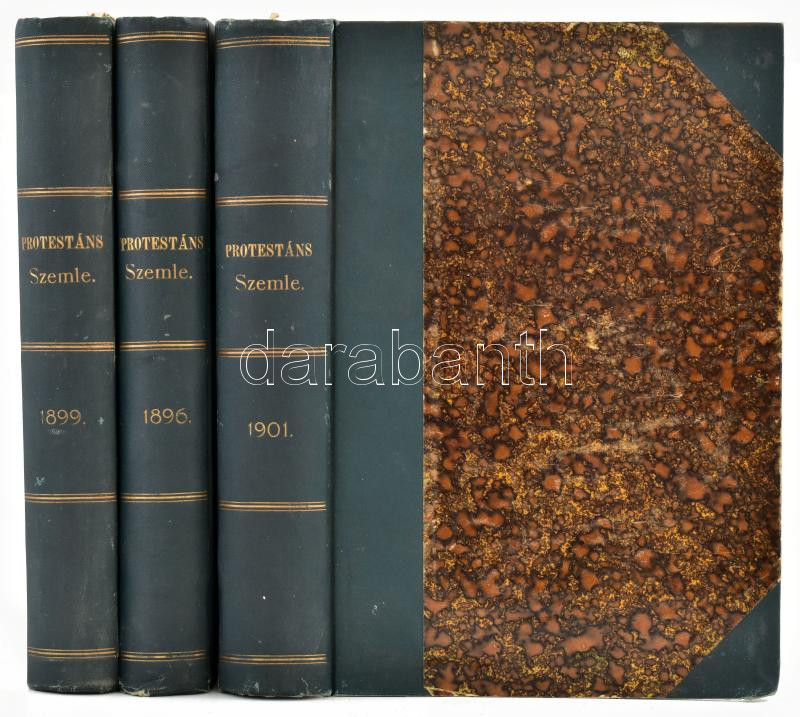 1896-1899-1901 Protestáns Szemle 3 évfolyama: 1896 VIII. évf., 1899. XI. évf. füzet, benne: Emlékkönyv a Magyar Protestáns Irodalmi Társaság 1899. szeptember 20-én Debreczenben tartott harmadik nagygyűlésről, 1901 XIII. évf., benne: Emlékkönyv a Magyar Protestáns Irodalmi Társaság ötödik vándorgyűléséről. Átkötött félvászon-kötésben, kopott borítókkal, kissé foltos lapélekkel, néhány ceruzás aláhúzással.