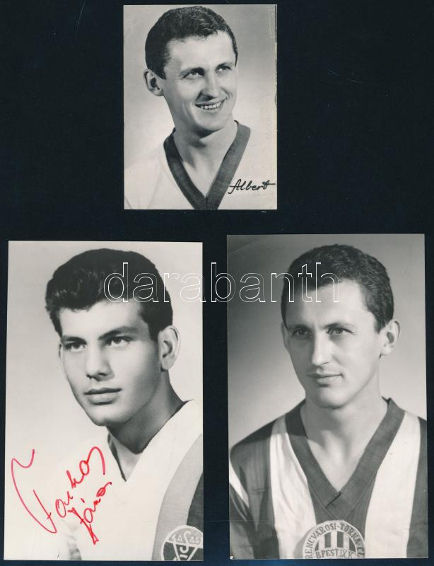 Farkas János (1942-1989) a Vasas olimpiai bajnok labdarúgójának aláírása egy őt ábrázoló fotón, 14x8 cm. Valamint Albert Flórián a FTC válogatott labdarúgójának 2 fotója, az egyiken "nyomtatott aláírással", 14x8 cm és 9x6 cm közötti méretben