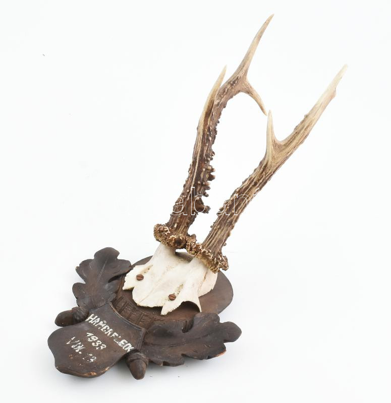 1933 Őzbak agancs, díszesen faragott talapzaton, h: 39 cm https://www.darabanth.com/hu/442-Gyorsarveres/442.0/Mutargy-papirregiseg-egyeb/Bolhapiac~500015/1933-Ozbak-agancs-diszesen-faragott-talapzaton-h-39-cm~II2907773