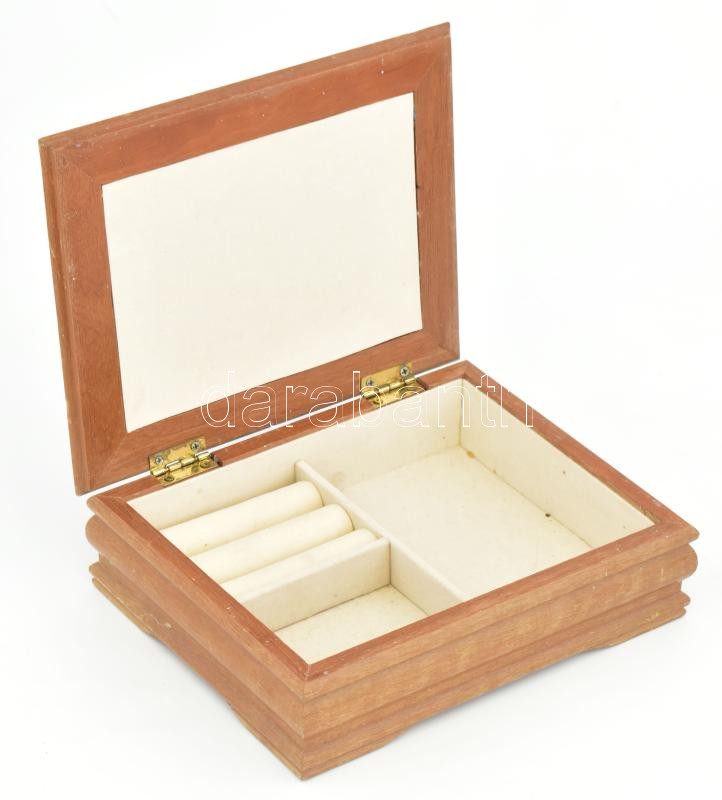 Leírás: Fa ékszeres doboz, fedelén gobelin díszítéssel, kis kopottsággal, 19x15x5 cm