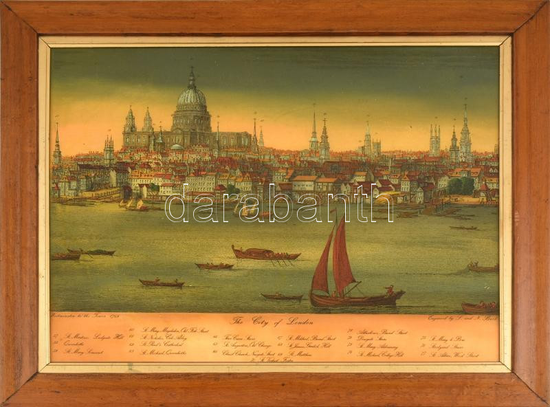 Leírás: London, régi metszet után készített üvegkép, fakeretben. Kopásnyomokkal. 45x56 cm
