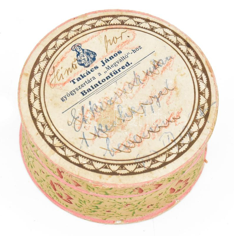 Leírás: Takács János Gyógyszertára a "Megváltó"-hoz Balatonfüred karton doboz, d: 9 cm