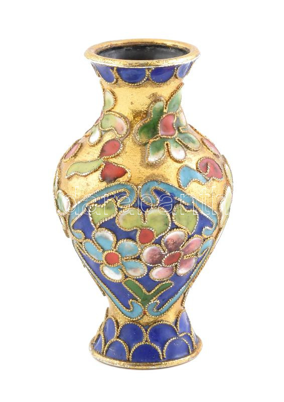 Leírás: Tűzzománcos kis réz váza, jelzés nélkül, m: 7,5 cm