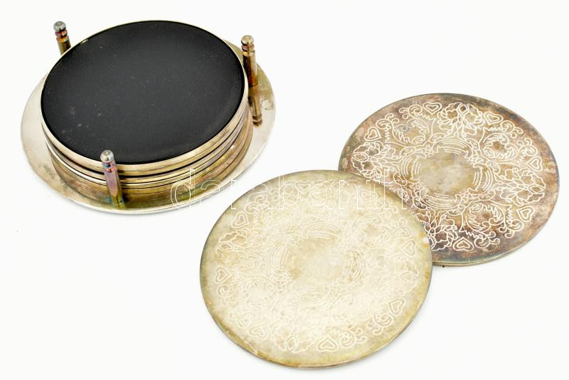 Leírás: Vintage poháralátét garnitúra, tartójában, fémlemezzel borított műanyag, jelzés nélkül, d: 9,5 cm