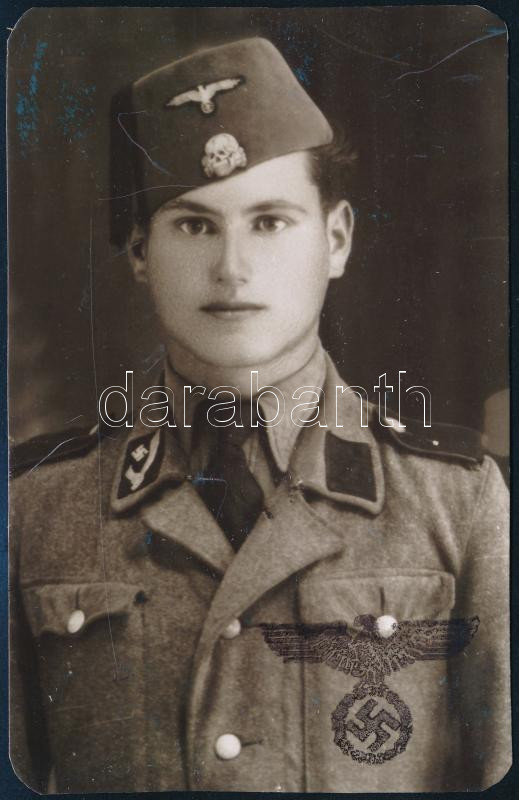 Az SS 13. (1. horvát) ,,Handschar" fegyveres-hegyihadosztálya katonájának portréja. (Az önkéntes Waffen-SS hadosztályt Heinrich Himmler és Gottlob Berger SS-vezetők javaslatára, Adolf Hitler jóváhagyásával állították fel 1943. tavaszán, főként muzulmán vallású bosnyákokból, és a háború végéig aktív volt). Modern előhívású fotó kartonon, hátoldalán horogkeresztes, "Likvidiran 16. V. 1943 Sarajevo" ill. egyéb bélyegzésekkel. (Múzeumi archívumból?) 14x9 cm. / Soldier of the 13th Waffen Mountain Division of the SS Handschar (1st Croatian). Modern photo on cardboard, with stamps on the back. (From museum archive?)