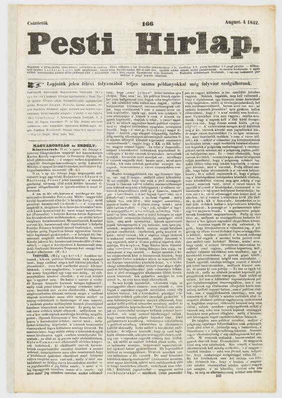 1842 Pesti Hírlap 166. sz. August. 4. 1842. Szerk.: Kossuth Lajos. Pest, Landerer Lajos, restaurált, 547-554 p. Benne korabeli hírekkel, érdekes írásokkal, korabeli reklámokkal, gőzhajómenetrendekkel, gabonaárakkal.