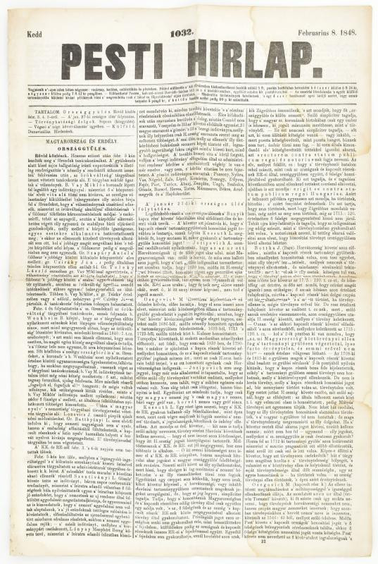 Leírás: 1848 A Pesti Hírlap február 8-i száma