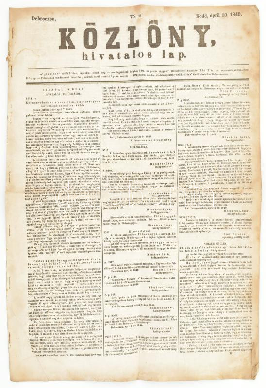 1849 Debrecen, a Közlöny április 10-i száma https://www.darabanth.com/hu/442-Gyorsarveres/442.0/Mutargy-papirregiseg-egyeb/Nyomtatvanyok~1000005/1849-Debrecen-a-Kozlony-aprilis-10-i-szama~II2908717