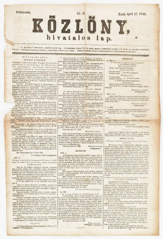 Leírás: 1849 Debrecen, a Közlöny április 17-i száma