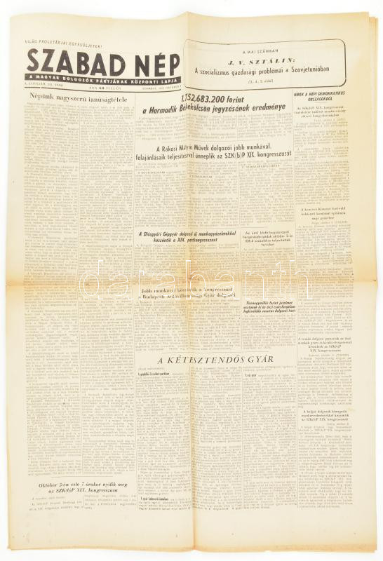 1952 A Szabad Nép X. évfolyamának 241. száma https://www.darabanth.com/hu/442-Gyorsarveres/442.0/Mutargy-papirregiseg-egyeb/Nyomtatvanyok~1000005/1952-A-Szabad-Nep-X-evfolyamanak-241-szama~II2908789