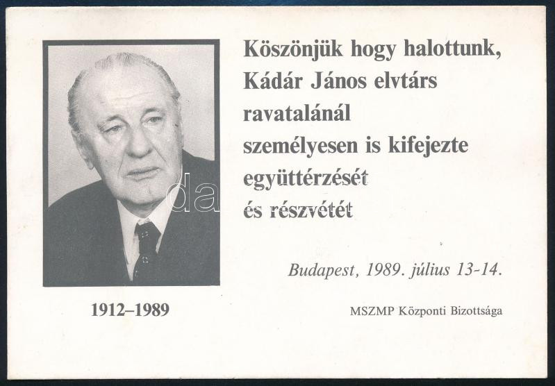 Leírás: 1989 Kádár János temetésén való részvétnyilvánítási köszönőlap, MSZMP KB., 9x13 cm