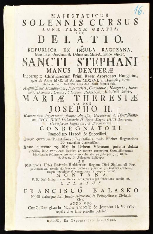 Balasko, Francisco: Majestaticus solennis cursus Lunae plenae gratia: seu delatio a republ. ex insula Ragusana S. Stephani manus dexterae incorruptae, quae ab a. 1090. ad a. 1526. in Hungaria, extra regnum vero Ragusae ultra duo saecula detenta fuit delata. Budae, 1770. Ex typogr. Landeriano. M. 20 p. Rézmetszetű illusztrációkkal: Szent István jobbkeze.
