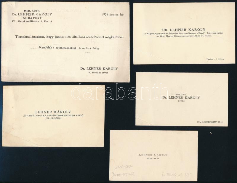 cca 1920-1930 Dr. Lehner Károly orvos, a Magyar Egyetemek és Főiskolák Országos Nemzeti "Turul" Szövetség vezére, az Orsz. Magyar Diáknyomorenyhítő Akció elnökének 5 db különféle névjegye