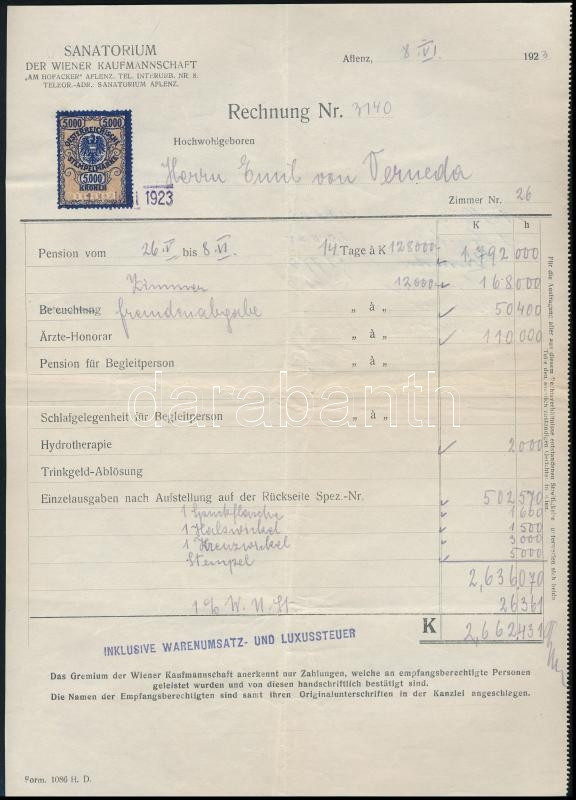 1923 Emil Verneda fiumei kormányfőtanácsos elhunytakor kiadott szanató... https://www.darabanth.com/hu/442-Gyorsarveres/442.0/Mutargy-papirregiseg-egyeb/Okmanyok~500021/1923-Emil-Verneda-fiumei-kormanyfotanacsos-elhunytakor-kiadott-szanatoriumi-szamla-plus-egy-keso~II2908527