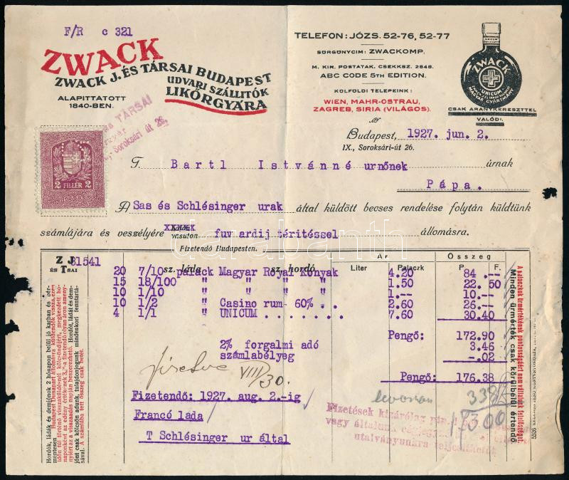 1927 Bp., Zwack J. és Társai Budapest fejléces számla és boríték https://www.darabanth.com/hu/442-Gyorsarveres/442.0/Mutargy-papirregiseg-egyeb/Okmanyok~500021/1927-Bp-Zwack-J-es-Tarsai-Budapest-fejleces-szamla-es-boritek~II2912113