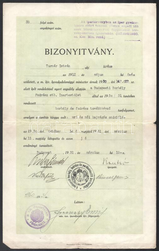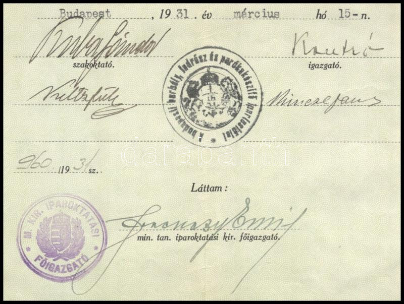 1931 Bp., a Budapesti Borbély-, Fodrász- és Parókakészítő Ipartestület által kiállított bizonyítvány borbély és fodrász továbbképző tanfolyam elvégzéséről, rajta Ferenczy Emil iparoktatási főigazgató saját kezű aláírásával, bélyegzőkkel
