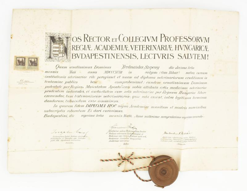 Leírás: 1942 A Budapesti Állatorvosi egyetem állatorvosi diplomája Szepessy Ferdinánd részére. Papír, függő viaszpecséttel
