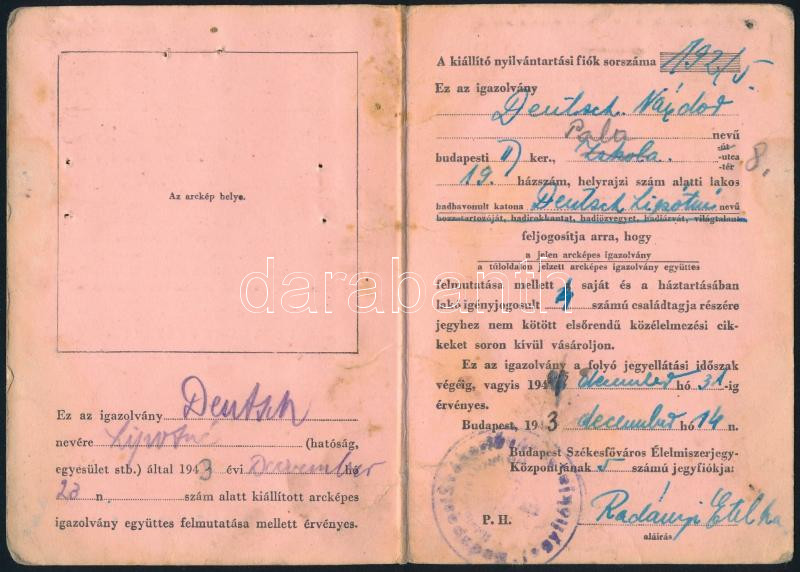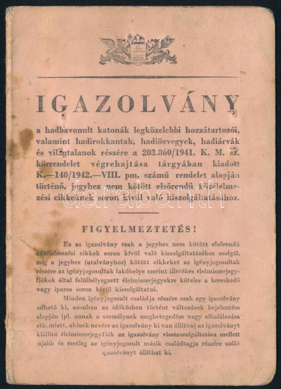 1943 Bp., igazolvány a hadbavonult katonák hozzátartozói, valamint hadirokkantak, hadiözvegyek, hadiárvák és világtalanok részére történő, jegyhez nem kötött közélelmezési cikkeknek soron kívül való kiszolgáltatásához. Kitöltve, fénykép nélkül.