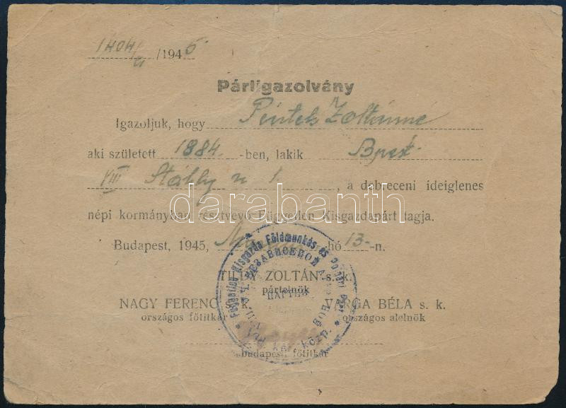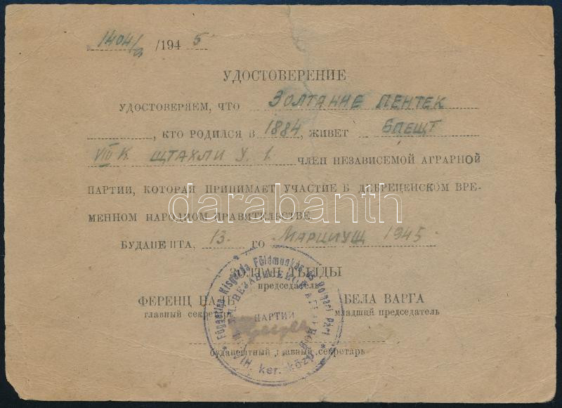 1945 Bp., a debreceni ideiglenes kormányban résztvevő Független Kisgazdapárt tagja részére kiállított pártigazolvány, kétnyelvű (magyar, orosz), bélyegzővel