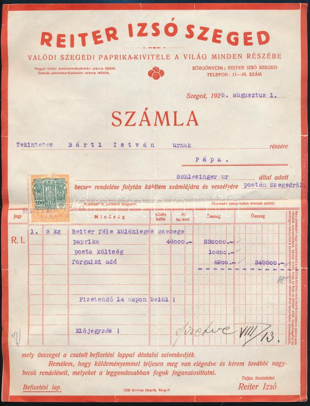 Leírás: Reiter Izsó Szeged, paprika nagykereskedő fejléces számla, 27x21 cm
