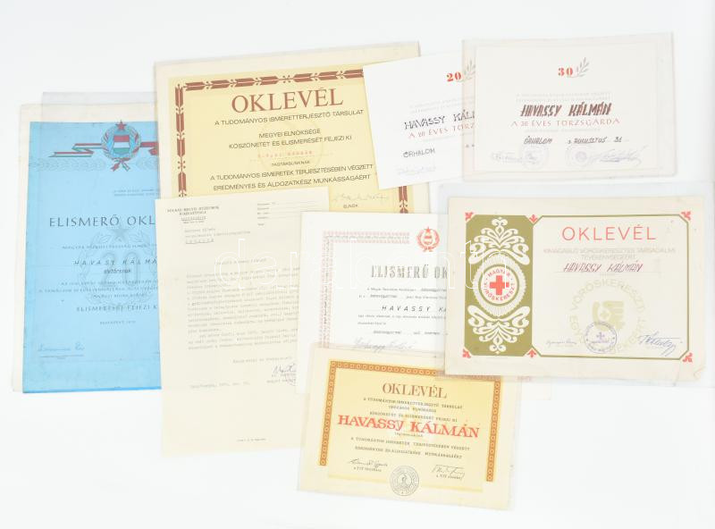 Leírás: cca 1970-1980 Havassy Kálmán népi ellenőr dokumentumai, elismerő oklevelei: Törzsgárda emlékjelvény adományozó oklevelek, TIT, Vöröskereszt, Békemozgalom oklevelek, stb., össz. 9 db