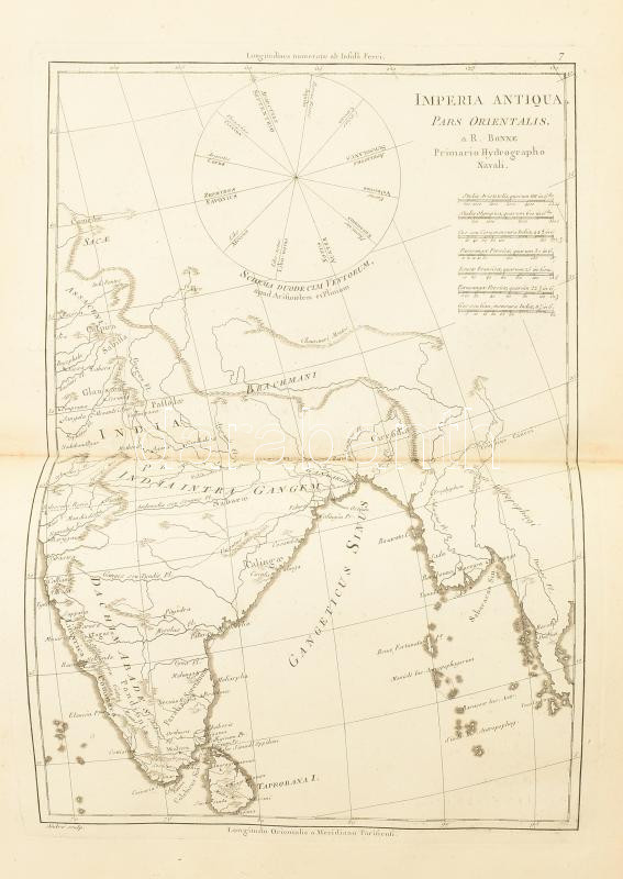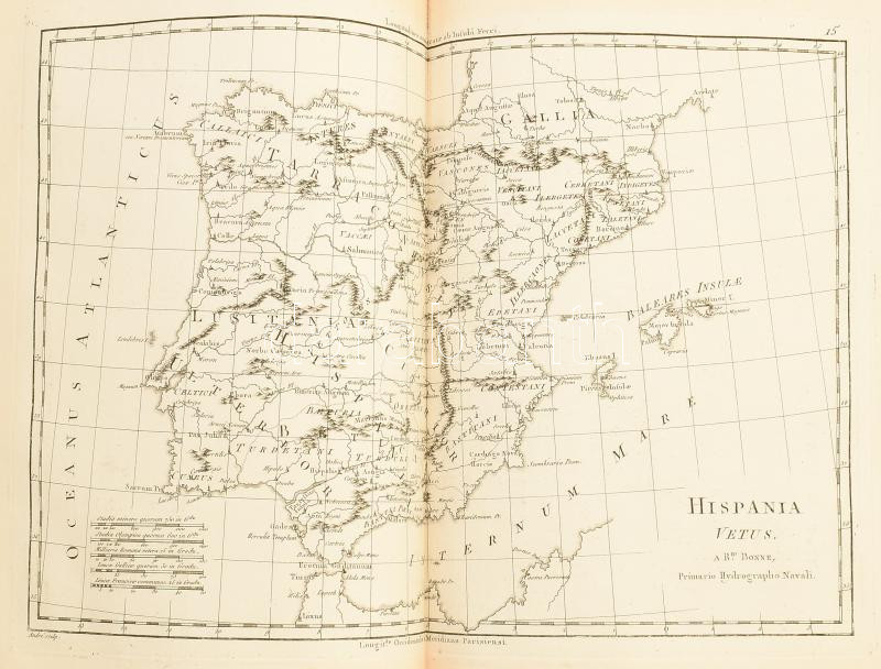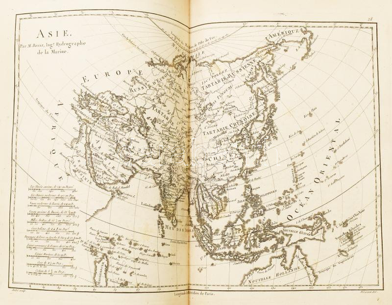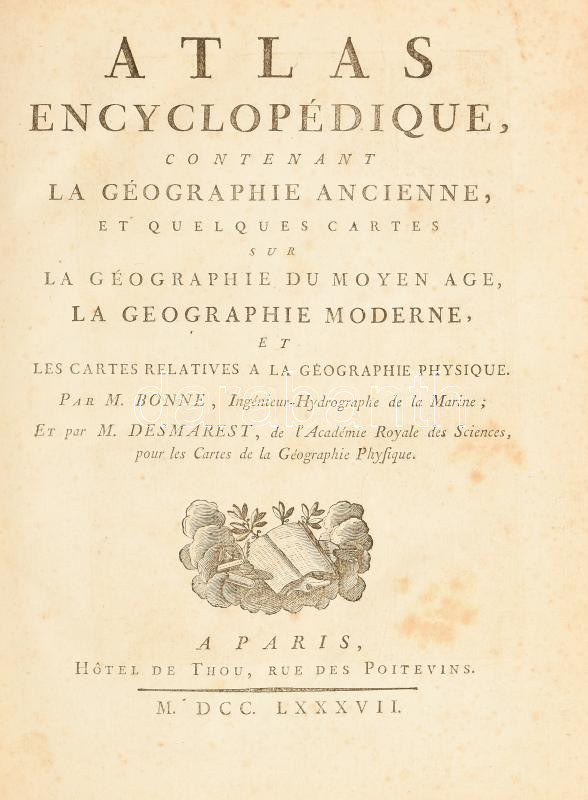 [Bonne, Rigobert - Desmarest, Nicolas]: Atlas Encyclopédique, contenant la géographie ancienne et quelques cartes sur la géographie du moyen age, la géographie moderne, et les cartes relatives ? la géographie physique, par M. Bonne... et par M. Desmarest... [grav. par André]. I. kötet. Paris, 1787, Hotel de Thou. 1t. (rézmetszetű, allegorikus címkép. C. Boily metsz.), 65p. (az atlasz térképeinek elemzése), 77 térkép (kétlapos rézmetszetek). Közte: Bonne: Royaume de Hongrie c. lapja M=1:3 830 000. Korabeli, gerincén aranyozott félbőr kötésben. Néhány lap enyhén foltos.