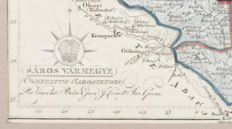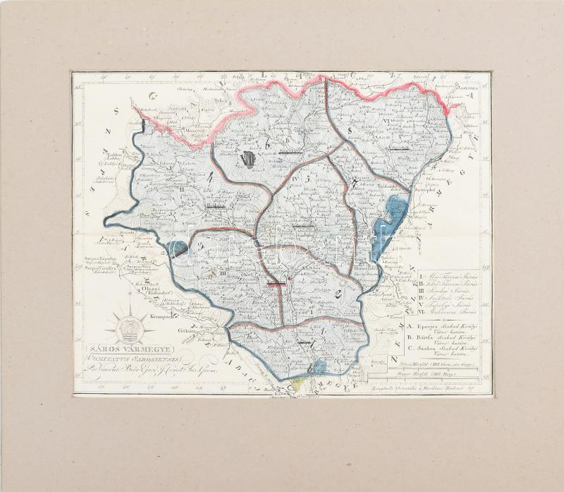cca 1800 Sárosvármegye térkép, Comitatus Sarosiensis). Magyarország vármegyéinek színezett, rézmetszetű, közigazgatási térképei, külön lapokon a Görög-féle atlaszból. Pest, Hartleben.Szép, tiszta, éles levonatú lapok, a járások feltüntetésével, korabeli színezéssel. kihúzással egyes területek római, illetve arab számokkal számozva. , paszpartuval. 29x23cm