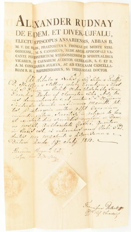 1810 Rudnay Sándor (1760-1831) későbbi erdélyi püspök (1815-1819), majd esztergomi hercegprímás, bíboros (1819-től haláláig) nevében kiadott, latin nyelvű egyházi okirat, felzetes szárazpecséttel