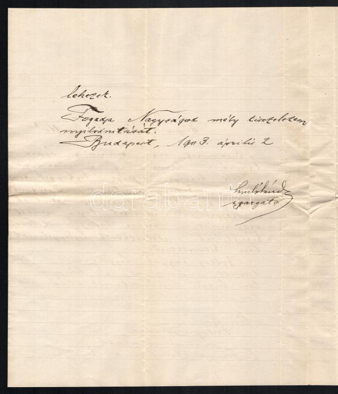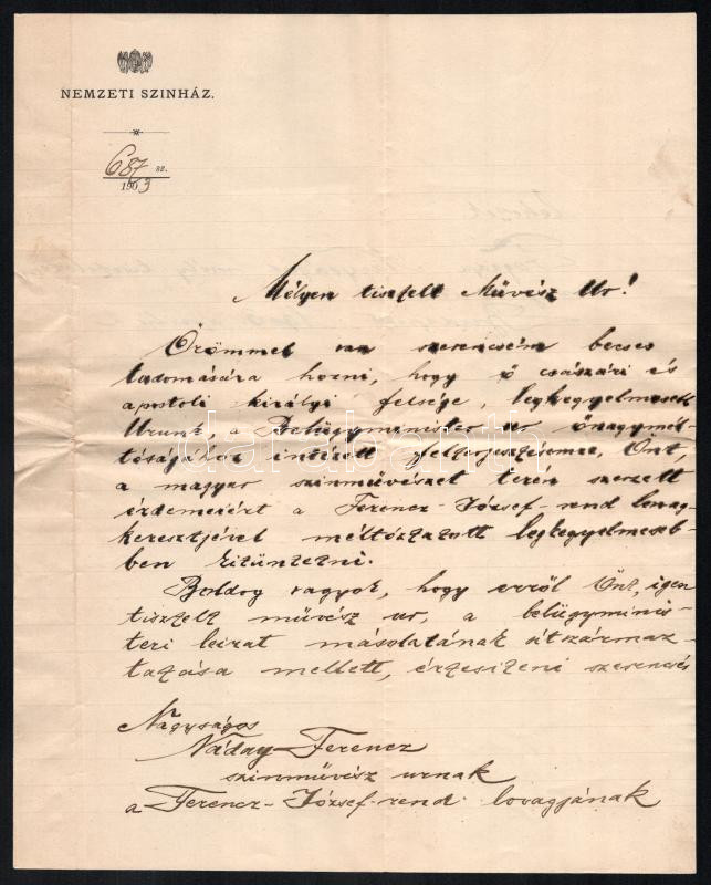 1903 Somló Sándor (1859-1916) színész, színházigazgató, a Nemzeti Színház igazgatójának saját kézzel írt levele, aláírásával Náday Ferenc (1840-1909) színművész részére, a nemzeti Színház fejléces papírján, benne értesítéssel, hogy érdemeiért Ferenc József-rend lovagkeresztjével tüntették ki.