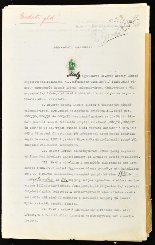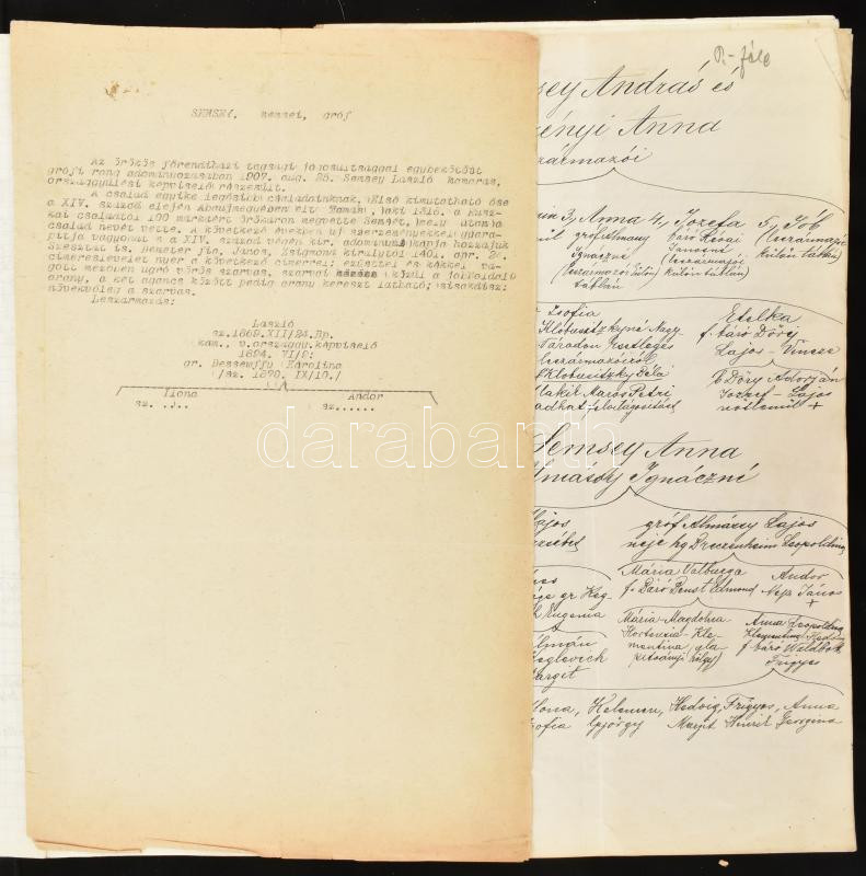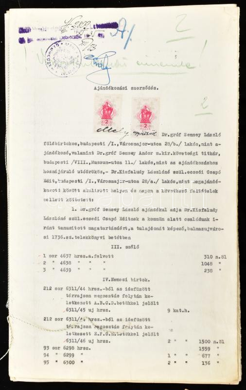 1909-1937 A gróf semsei Semsey-családra vonatkozó iratok, rendkívül izgalmas családtörténeti hagyaték: 1933 A balmazújvárosi gróf Semsey-kastély alaprajzai és keresztmetszete, valamint a hozzá tartózó gépelt leírás, 1,5 oldal gépelt irat, valamint 34x21 cmx3.; 1935 Gróf Semsey László által Dr. Kisfaludy Lászlóné Csapó Edit részére szóló birtokajándékozási szerződés Balmazújvárosban, a "kommün alatt családunk iránt tanúsított magatartásáért," a birtok vázlatrajzával, rajtuk Semsey László, Semsey Andor, valamint Kisfaludy Lászlóné aláírásaival, 2,5 gépelt oldal, vázlatrajz, 61x46 cm; cca 1895 Semsey-családfa, kézzel rajzolt családfa, 33x41 cm; 1909 Semsey András é báró Perényi Anna leszármazottainak családfája, 3 beírt oldal.; 1924 A semsey Semsey-család anyaiágon való erszármazásának táblája 1523-1923-ig.; cca 1920-1940 Semsey László (1869-1943) származására vonatkozó gépelt irat.; 1937 Semesy László és balmazújvárosi lakos között létrejött adásvételi szerződés, vázlatrajzzal.; 1929 Szeged, kézzel írt levél családtörténeti iratok ügyében, 1,5 beírt oldal.; Rendkívül izgalmas családtörténeti dokumentum.
