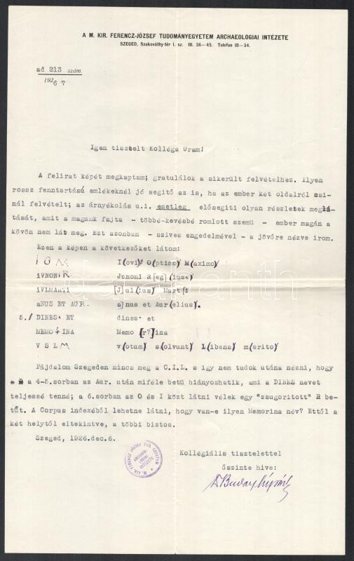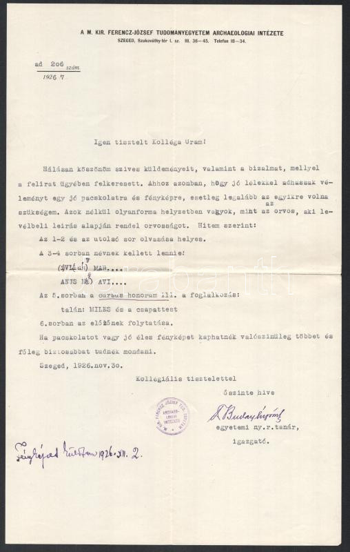 https://www.darabanth.com/hu/442-Gyorsarveres/442.0/Mutargy-papirregiseg-egyeb/Tortenelmi-dokumentumok-keziratok-erdekessegek~500022/1926-Szeged-a-M-Kir-Ferenc-Jozsef-Tudomanyegyetem-Archeologiai-Intezetenek-tanara-altal-i~II2910742