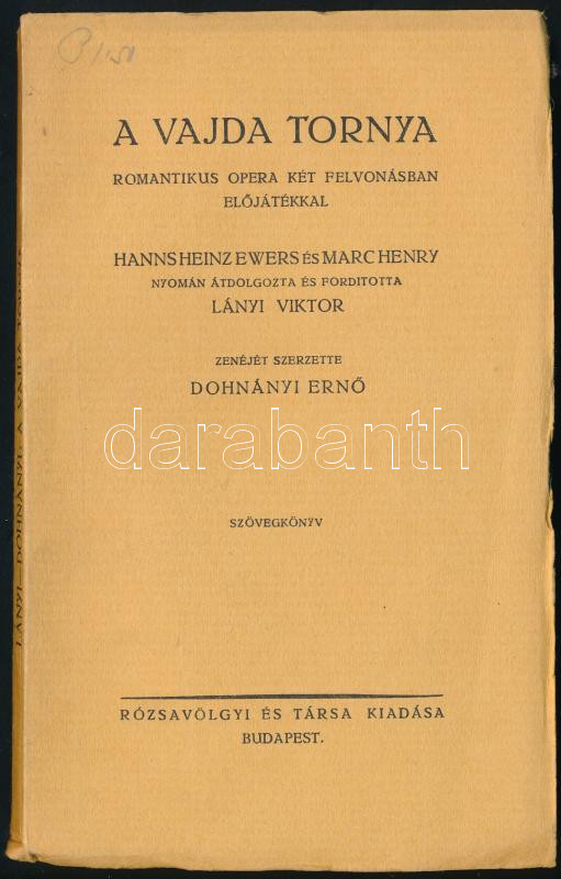 A vajda tornya. Romantikus opera két felvonásban előjátékkal. Hans Heinz Ewers és Marc Henry nyomán átdolgozta és fordította: Lányi Viktor. Zenéjét szerezte: Dohnányi Ernő. Szövegkönyv. Bp.,én.,Rózsavölgyi és Társa. Kiadói papírkötés.