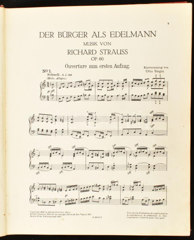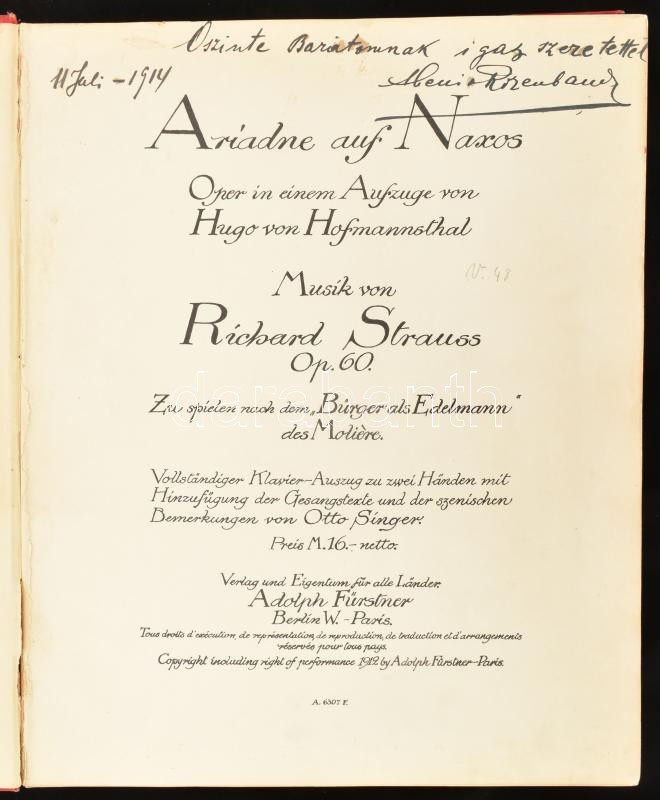 Richard Strauss: Ariadne auf Naxos. Oper in einem Auszuge von Hugo von Hofmannsthal. Musik von - - Op. 60. Berlin-Paris, 1912., Adolph Fürstner. Átkötött félvászon-kötés, kopott borítóval, ajándékozási sorokkal, sérült gerinccel.