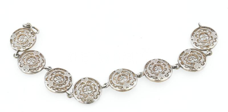 Leírás: Ezüst(Ag) kerek filigrán díszítésű elemekből álló karkötő, jelzett, h: 16,8 cm, nettó: 12,6 g