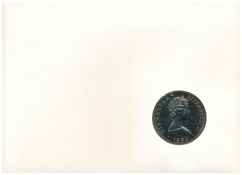 Gibraltár 1980. 1C Cu-Ni "Horatio Nelson halálának 175. évfordulója" forgalomba nem került emlékkiadás felbélyegzett borítékban, bélyegzéssel, német nyelvű leírással T:AU Gibraltar 1980. 1 Crown Cu-Ni "175th Anniversary of the death of Lord Horatio Nelson" non-circulating commemorative coin in envelope with stamp, cancellation, and a description in german C:AU Krause KM#12