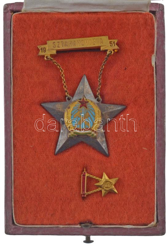 Leírás: 1951. "Sztahanovista" zománcozott fém kitüntetés "3570" sorszámmal, miniatűrre, eredeti tokban T:XF