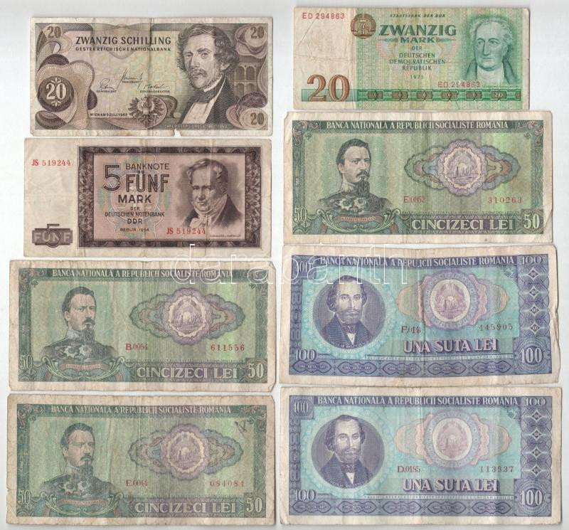 8db vegyes külföldi bankjegy: Német Demokratikus Köztársaság 1964. 5M + 1975. 20M, Ausztria 1967. 20Sch + Románia Románia 1966. 50L (3x) + 100L (2x) T:F,VF 8pcs of mixed banknotes: German Democratic Republic 1964. 5 Mark + 1975. 20M, Ausztria 1967. 20 Schilling + Romania 1966. 50 Lei (3x) + 100 Lei (2x) C:F,VG