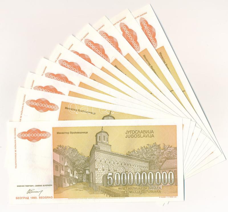 Jugoszlávia 1993. 5.000.000.000D (10x) sorszámkövetők "AA 6078231... https://www.darabanth.com/hu/442-Gyorsarveres/442.0/Numizmatika/Kulfoldi-bankjegyek~1500014/Jugoszlavia-1993-5000000000D-10x-sorszamkovetok-AA-6078231-AA-6078240-TAU-halvany-vC3~II2906238