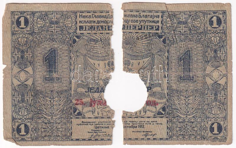 Leírás: Montenegró 1912. 1P felülbélyegzéssel, lyukasztással érvénytelenítve, ketté szakadva T:G Monenegro 1912. 1 Perper with overprint, cancelled with hole, split in two C:G Krause P#1.a