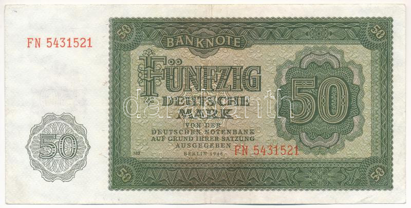 GDR 1948. 50 Mark... https://www.darabanth.com/hu/442-Gyorsarveres/442.0/Numizmatika/Kulfoldi-bankjegyek~1500014/NDK-1948-50M-FN-5431521-TF-szep-papir-GDR-1948-50-Mark-FN-5431521-CF-fine-paper-Krause-P~II2906990