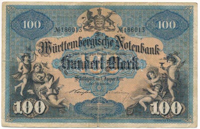 German Empire / Württemberg 1911. 100 Mark "186013" on watermarked paper C:F