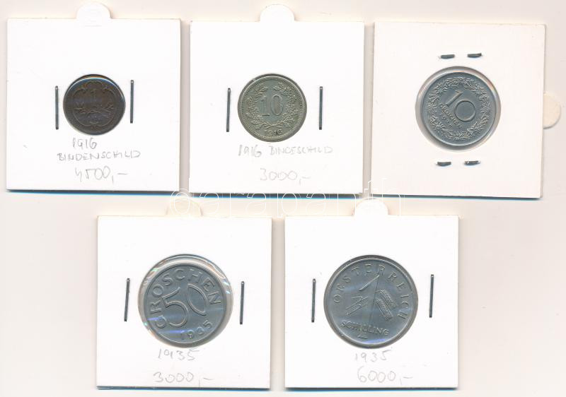 Leírás: Ausztria 1916. 1h bronz + 10h Cu-Ni + 1928. 10gr Cu-Ni + 1935. 50gr Cu-Ni + 1Sch Cu-Ni T:AU-VF