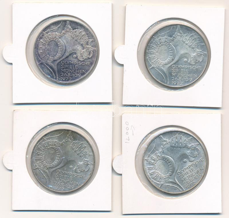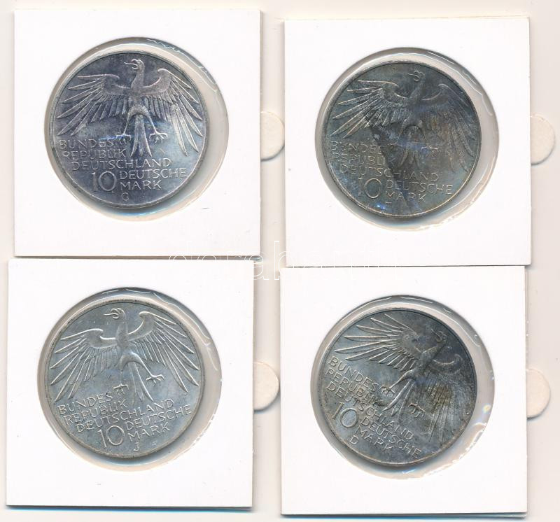 NSZK 1972. 10M Ag "Nyári Olimpiai Játékok München / Stadion" (4xklf, D, F, G és J verdejelekkel) T:AU,XF patina FRG 1972. 10 Mark Ag "Olympic Games Munich / Stadium" (4xdiff with "D, F, G and J mintmarks) C:AU,XF patina Krause KM#133