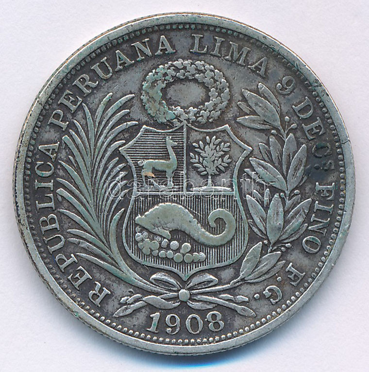 Peru 1908. 1/2 Sol Ag C:XF,VF patin... https://www.darabanth.com/hu/442-Gyorsarveres/442.0/Numizmatika/Kulfoldi-fem-es-ezustpenzek~1500015/Peru-1908-12S-Ag-TXF-VF-patina-Peru-1908-12-Sol-Ag-CXF-VF-patina-Krause-KM23203~II2892298