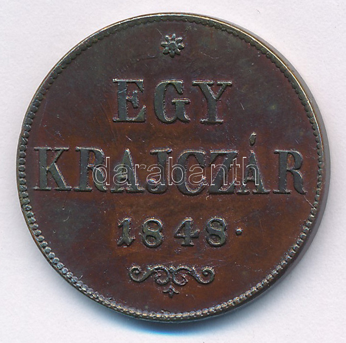 Adamo B1 https://www.darabanth.com/hu/442-Gyorsarveres/442.0/Numizmatika/Magyar-es-magyar-verdejelu-fem-es-ezustpenzek~1500008/1848-1kr-Cu-TAU-patina-Adamo-B1~II2907399