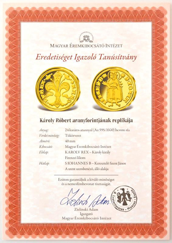 Leírás: DN "A legértékesebb magyar érmék - Károly Róbert aranyforintjának replikája" aranyozott Cu emlékérem, "COPY" jelzéssel, tanúsítvánnyal (40mm) T:PP