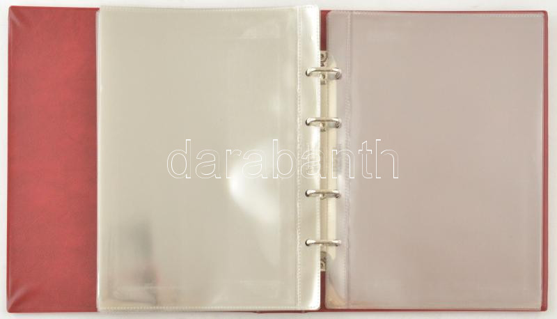 Leírás: "Banknoten Briefe aus aller Welt" piros, plüssborítású, négygyűrűs album 40db, osztás nélküli, berakólappal. Használt, jó állapotban