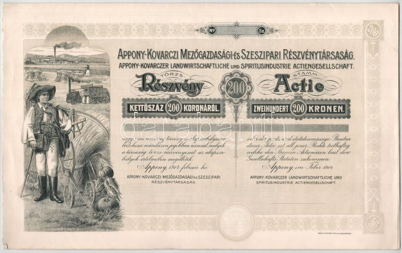 Appony 1914. "Appony-Kovarczi Mezőgazdasági és Szeszipari Részvén... https://www.darabanth.com/hu/442-Gyorsarveres/442.0/Numizmatika/Reszvenyek-es-sorsjegyek~1500005/Appony-1914-Appony-Kovarczi-Mezogazdasagi-es-Szeszipari-Reszvenytarsasag-reszvenye-200K-~II2912983