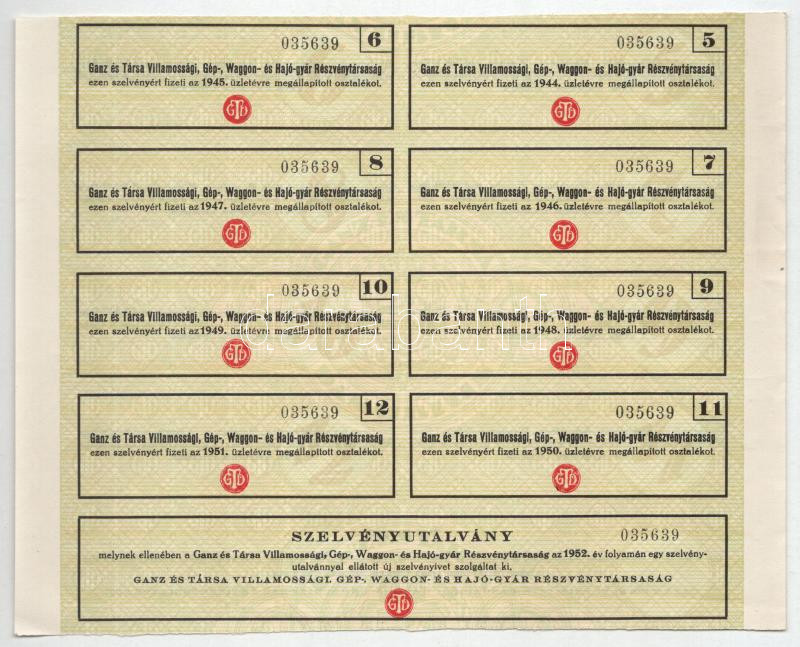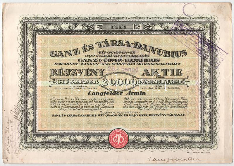 Budapest 1923. "Ganz és Társa-Danubius Gép-, Waggon- és Hajó-Gyár Részvénytársaság" részvénye 20.000K-ról, magyar és német nyelven, szárazpecséttel, bélyegzésekkel és szelvényekkel T:XF